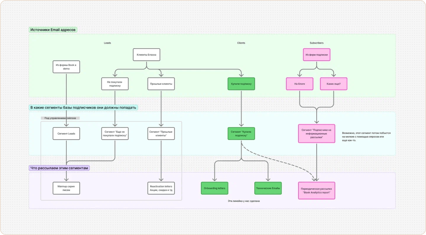 - Личный подход: цепочки по истечению подписки временно отключены, поскольку в B2B-сегменте личные сообщения от менеджера пока работают эффективнее автоматических цепочек. Но база для автоматизации готова, и если поток клиентов вырастет, Blask сможет снова запустить эти процессы нажатием одной кнопки.