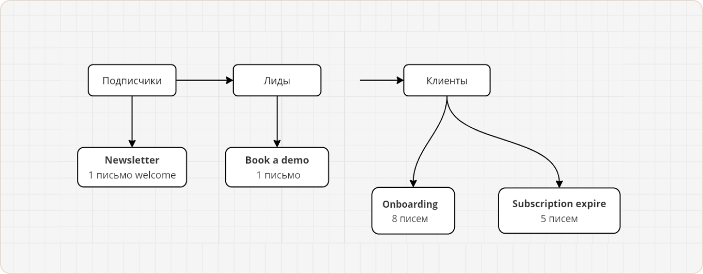 - Фокус на главном: оставили в активной работе две ключевые цепочки — Onboarding (8 писем) и Book a Demo. Эти цепочки дают максимальный профит в конверсии.