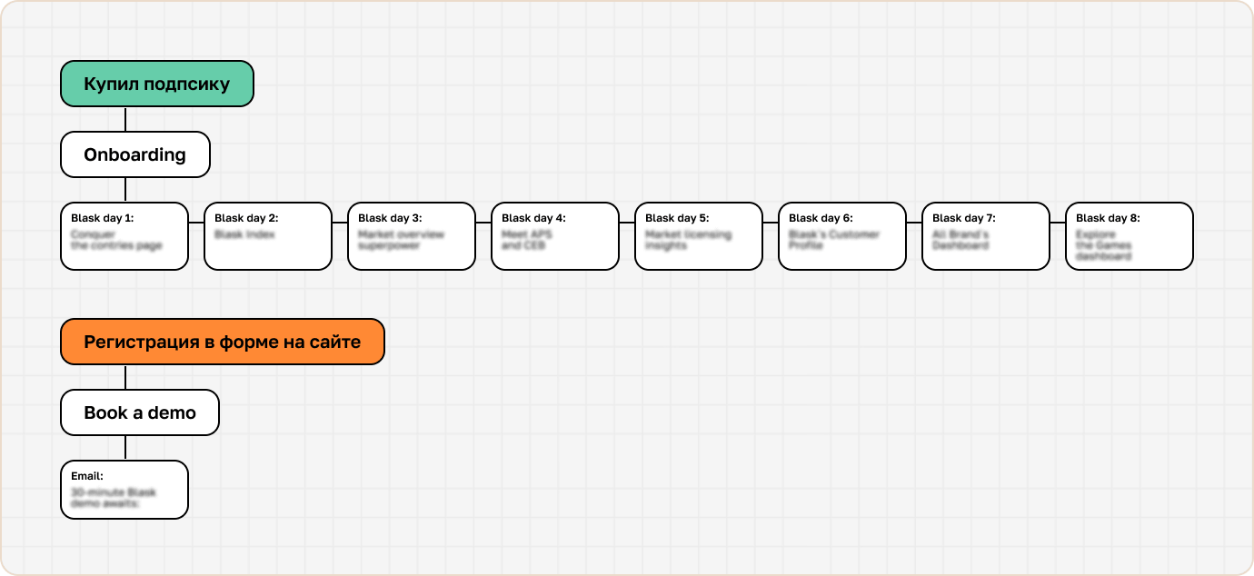 - Onboarding: цепочка из 8 писем, которые знакомят пользователей с Blask.